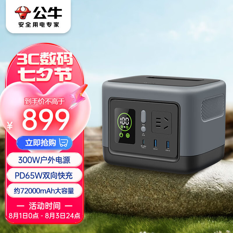 公牛【3C认证】300W户外电源 便携PD65W双向快充 220v充电宝 72000mAh大容量停电应急露营备用移动电源价格:899.00元!