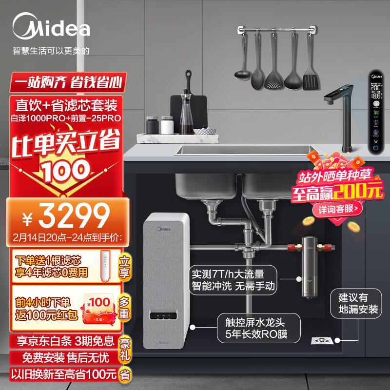 美的(Midea)省芯直饮净水器套装【白泽1000Gpro+前置过滤器-25pro】厨下式智能水龙头 RO反渗透家用一体净饮机价格:3499.00元!