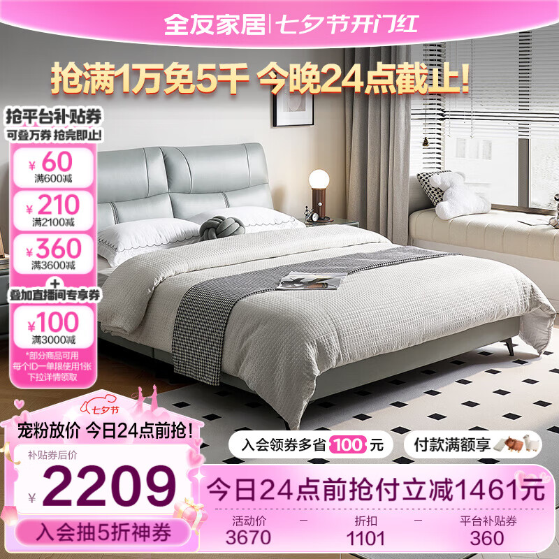 全友家居 真皮艺床现代轻奢主卧室头层牛皮双人大床1.8x2米家具105201价格:3670.00元!