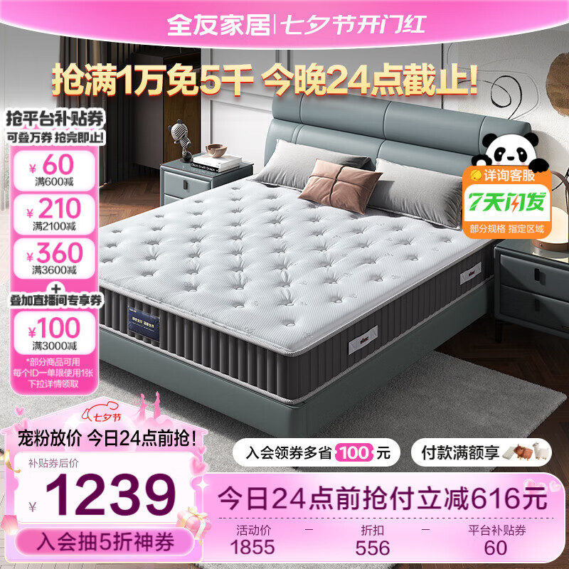 全友家居 乳胶床垫 软硬两用 五区独袋弹簧床垫105169-1价格:1855.71元!