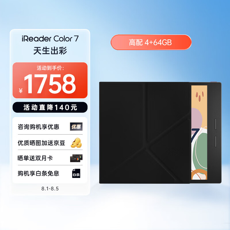 掌阅iReader Color7 彩色墨水屏 7英寸电纸书阅读器 高刷智能电子书平板 轻量便携 儒雅黑·套装 4+64GB价格:1758.00元!
