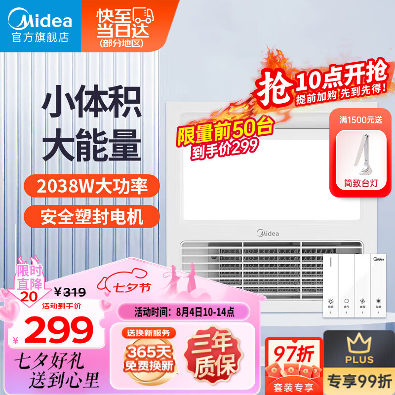 美的(Midea)风暖浴霸排气扇照明一体集成吊顶卫生间浴室灯正方形小型暖风机价格:319.00元!