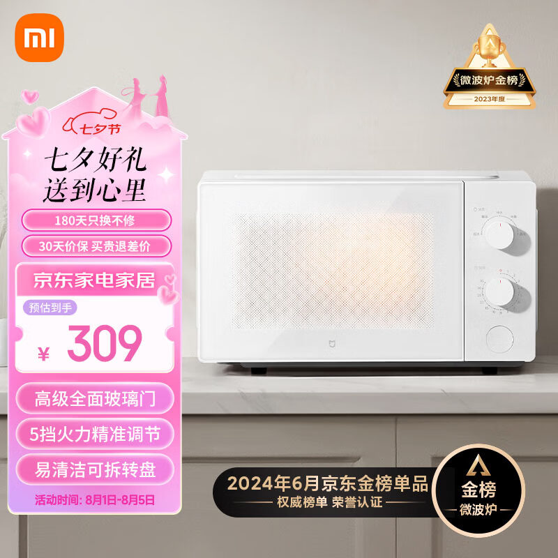 米家小米微波炉家用小型多功能 小尺寸可拆转盘式 大火力均匀加热 机械式双旋钮易操作 台式大容量20升价格:309.00元!
