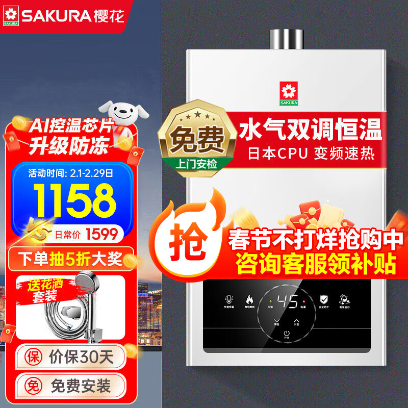 樱花(SAKURA)燃气热水器水气双调智能精控恒温直流变频降噪触控强排式热水器低压启动多重防护 JSQ25-NJP007A【升级防冻】13L天然气价格:1158.00元!