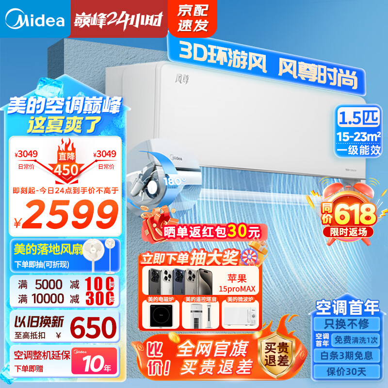 美的(Midea)空调1.5匹 风尊时尚版 新一级能效 3D环游风 变频冷暖壁挂式空调挂机智能家电 KFR-35GW/N8MXC1价格:2599.00元!