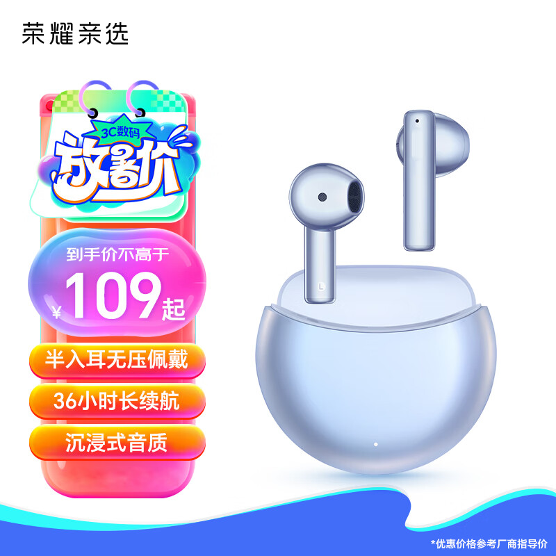 荣耀亲选MOECEN X5e 真无线蓝牙耳机 半入耳无压佩戴|36小时长续航|沉浸式音质 薄纱蓝价格:109.00元!