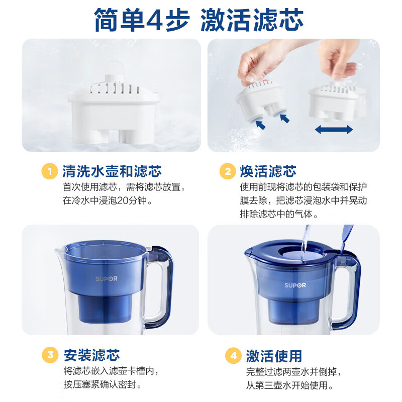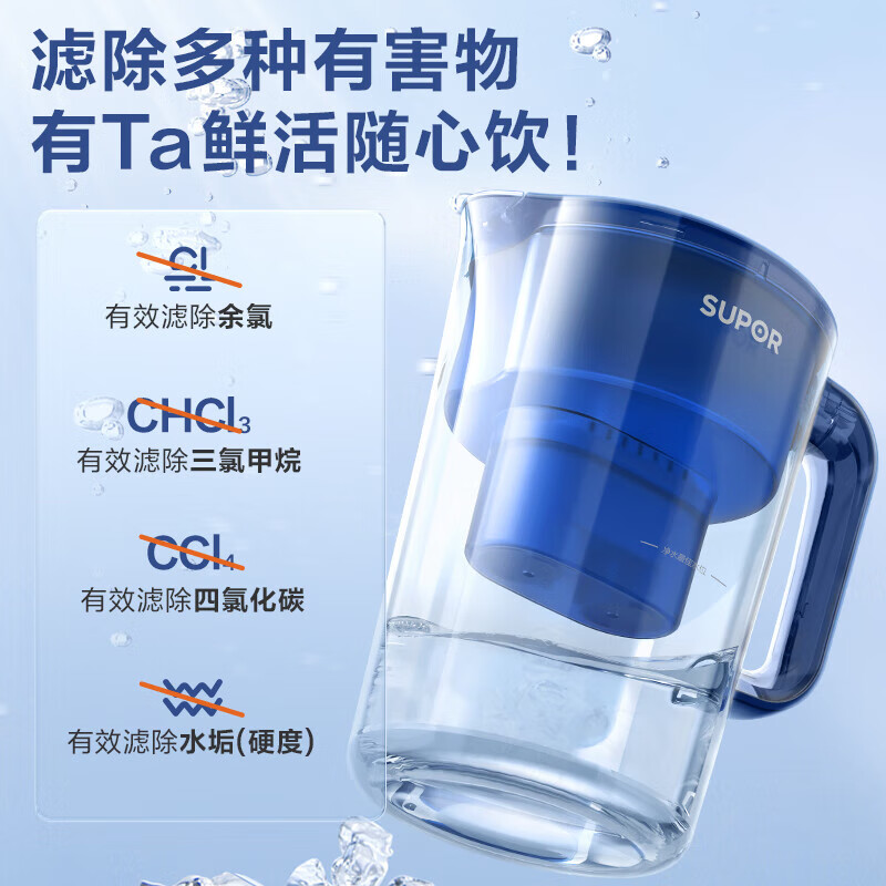 苏泊尔(SUPOR) 过滤净水器 家用滤水壶净水壶 自来水活性炭过滤器家用厨房净水器直饮滤水器滤水壶UF03一机一芯价格:89.00元!