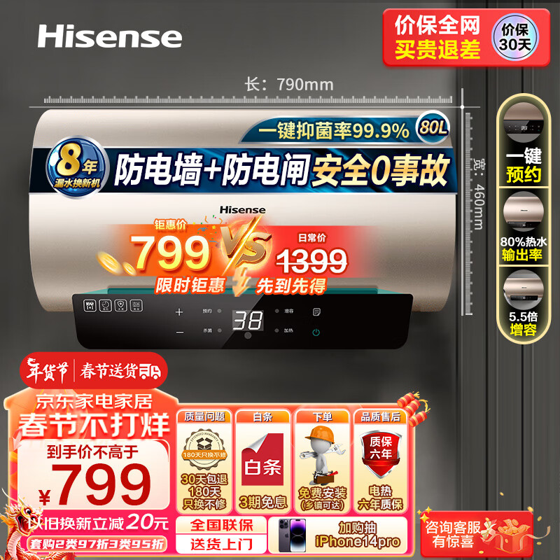 海信(Hisense)80升家用电热水器2100W速热 5.5倍增容 大屏触控 内胆自清洁双重防电保护DC80-W1513T【以旧换新】价格:899.00元!