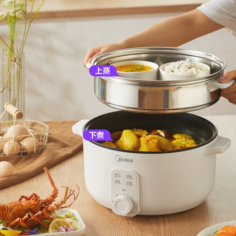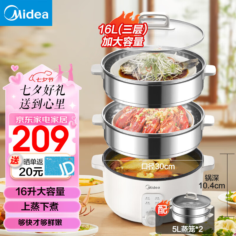 美的(Midea) 多用途锅电蒸锅电煮锅 多功能蒸煮锅 电火锅电热锅三层大容量不锈钢机身 30cm口径 大容量丨ZGE3051 16L价格:229.00元!