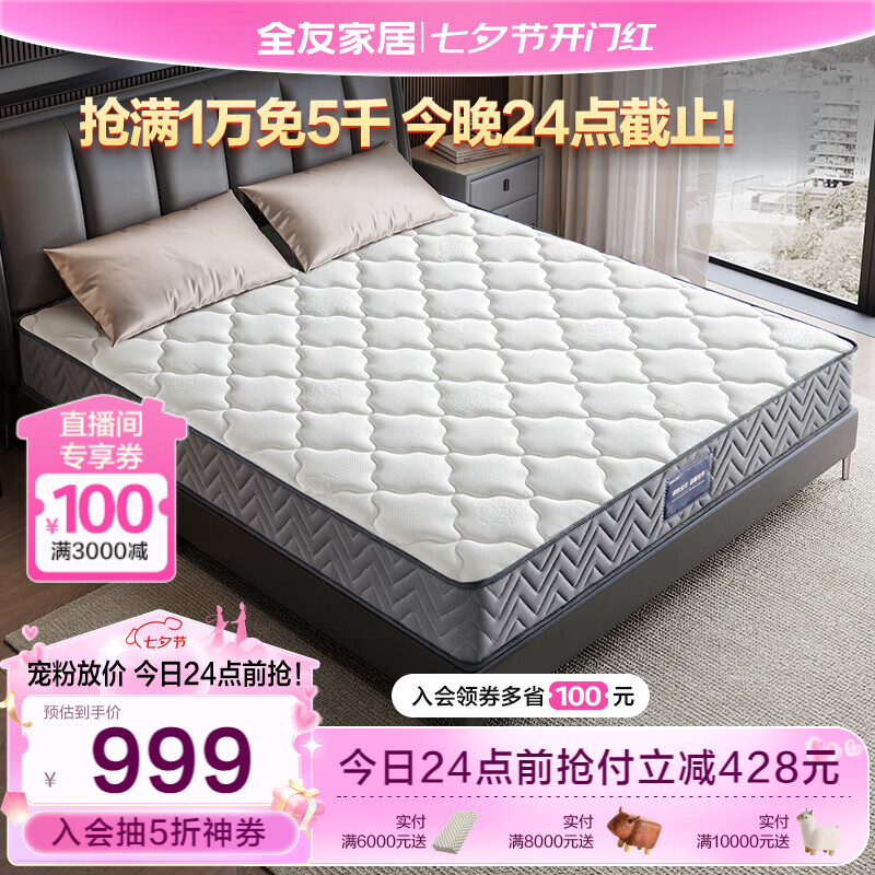 全友家居 进口天然乳胶床垫1.8x2米弹簧环保椰棕偏硬床垫子家用105190价格:1427.14元!