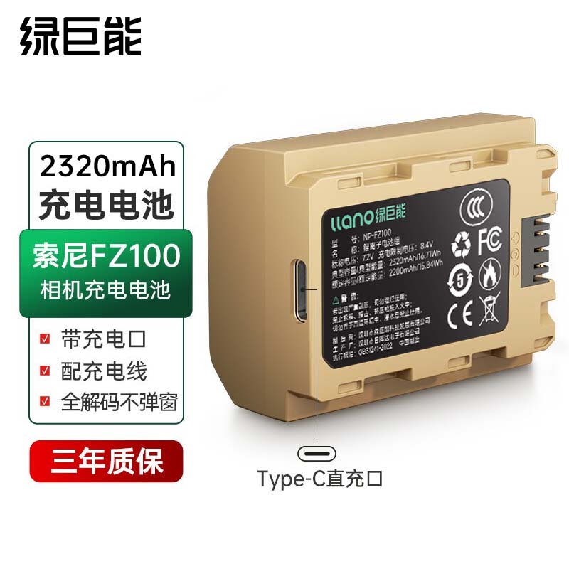 绿巨能(llano)索尼FZ100相机电池a7m3直充电池a9/a7r3/a7s3/a7m4/a6600微单单反电池Type-C接口2320mAh价格:249.00元!