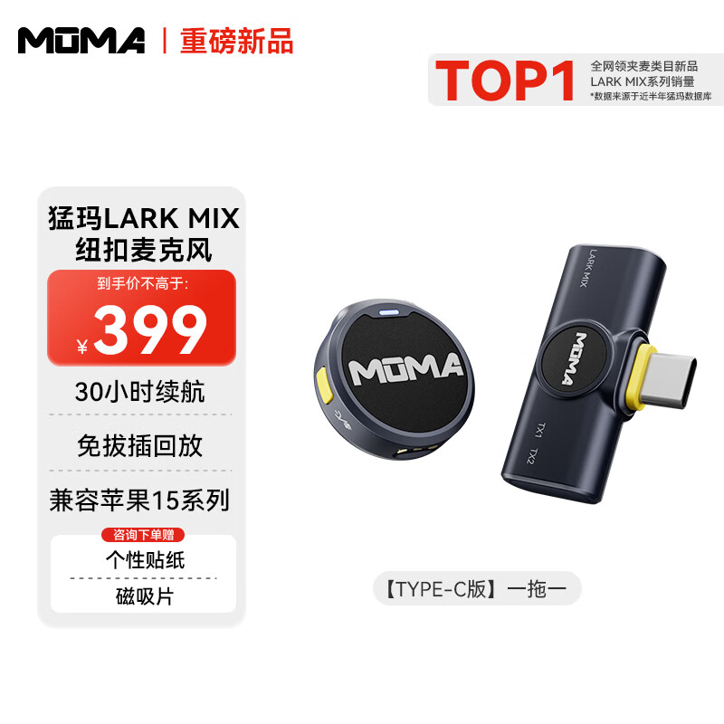 猛玛(MOMA)Lark Mix 一拖一无线领夹麦克风猛犸手机直播vlog户外采访微小型纽扣收音麦Type-C版黑色价格:399.00元!
