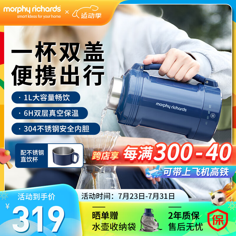 摩飞电器(Morphyrichards)电水壶 便携式烧水壶家用旅行户外大容量电热水壶保温壶 双层不锈钢防烫电热水杯MR6061轻奢蓝价格:359.00元!