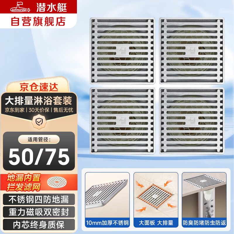 潜水艇(Submarine)不锈钢防臭地漏套装50管径大排量四个装淋浴四防地漏 超值套装价格:348.00元!