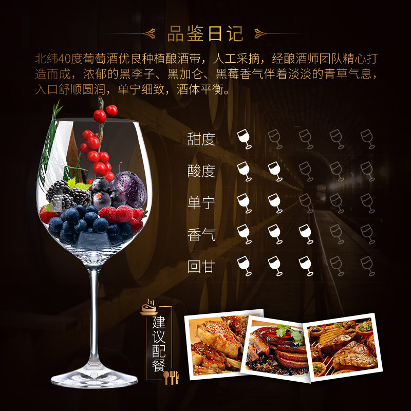 葡萄品种:赤霞珠(CabernetSauvignon),蛇龙珠(CabernetGernischt),品丽珠(CabernetFranc)