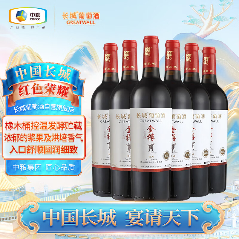 长城 金樽 经典甄选橡木桶解百纳干红葡萄酒 750ml*6瓶 整箱装价格:180.00元!