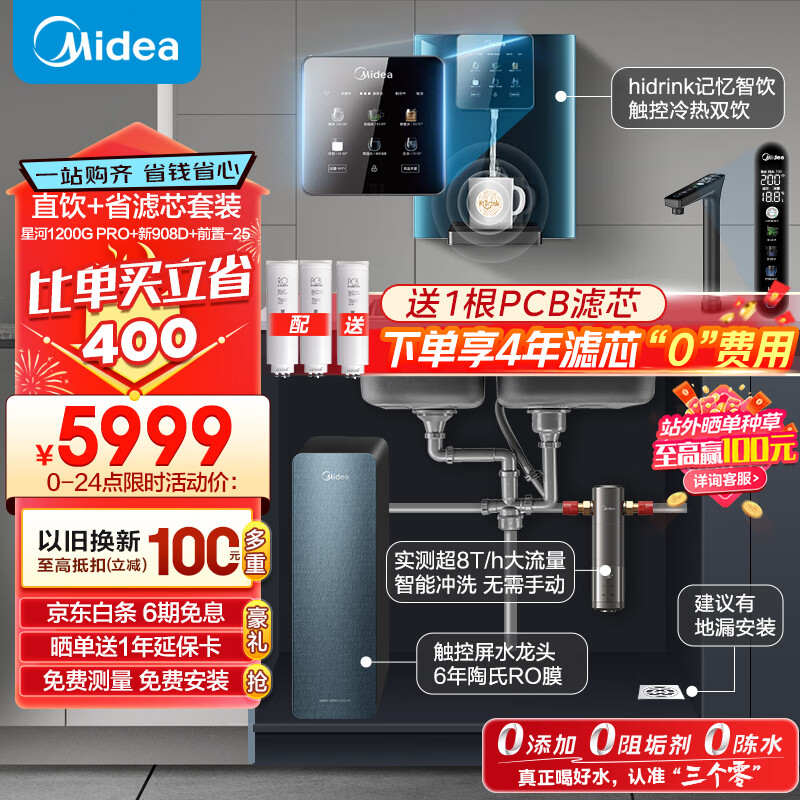 美的(Midea)省芯直饮冷热净水器套装【星河1200pro+管线机908D+前置-25pro】hidrink 壁挂式加热一体净饮机价格:5999.00元!