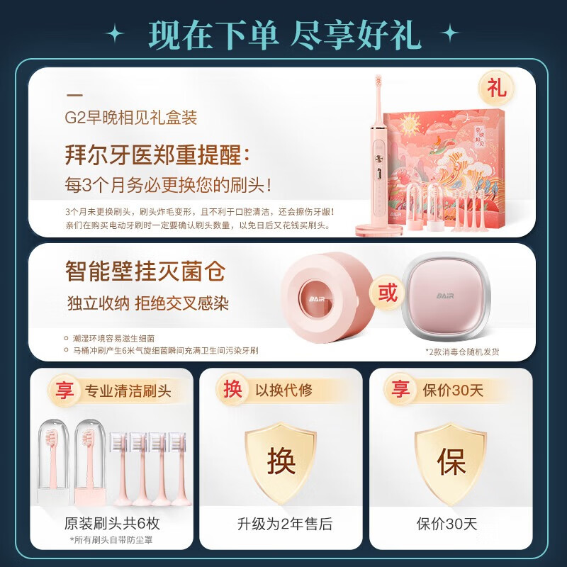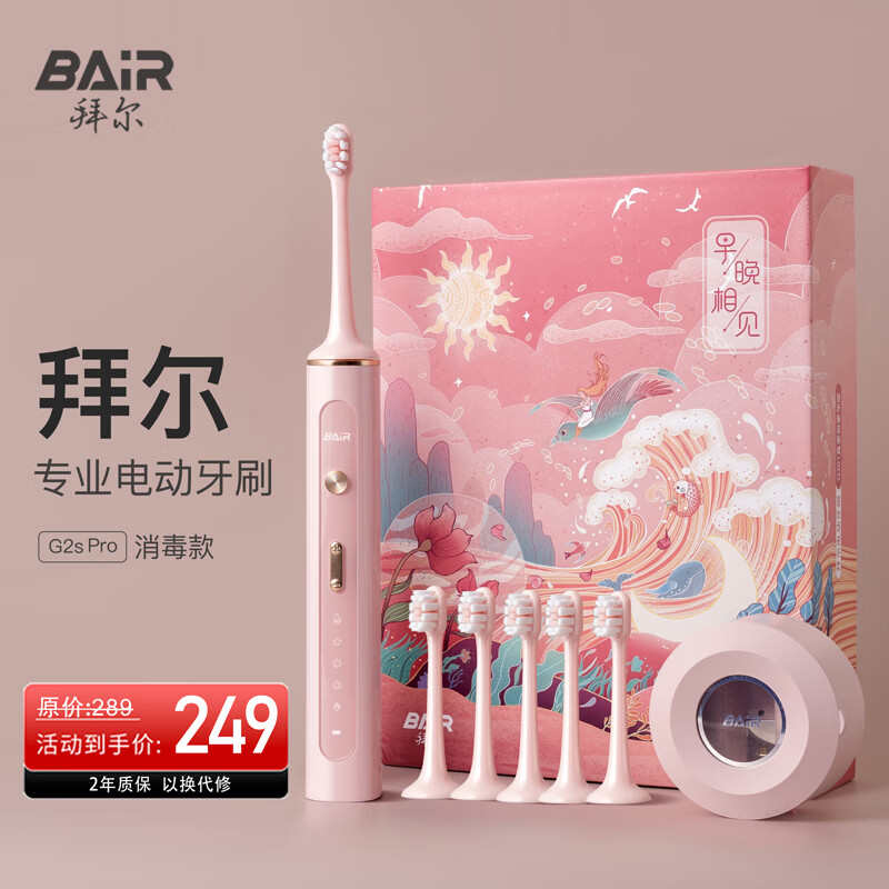 拜尔(BAIR)G2 Pro 高端消毒旗舰机 电动牙刷成人震动充电智能声波学生情侣全自动男士女送朋友礼物 礼盒装 真爱粉【G2s Pro 灭菌款】价格:289.00元!