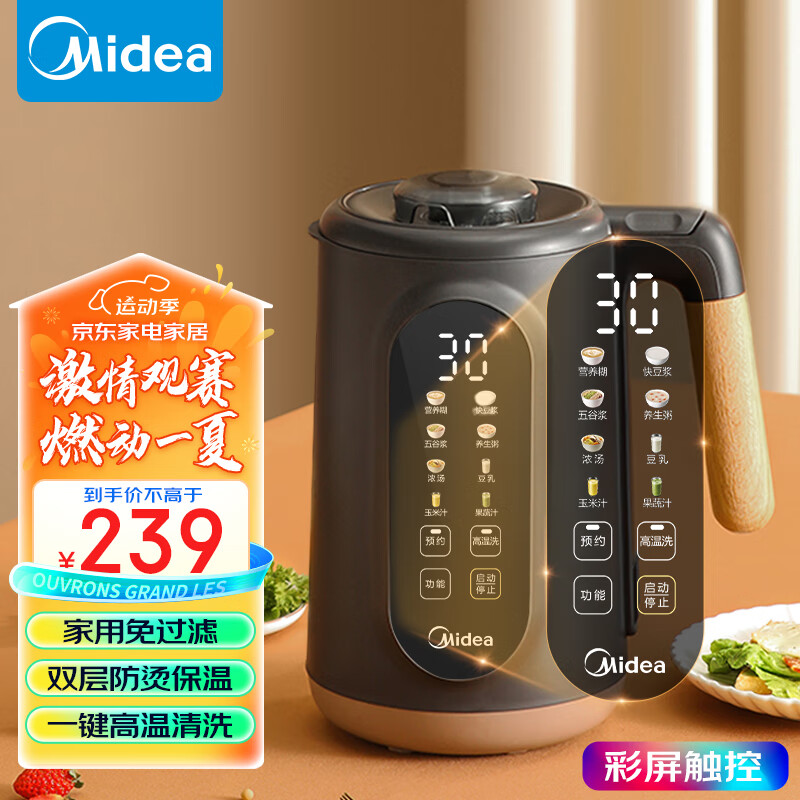 美的(Midea)豆浆机 家用破壁机1L家庭容量全自动免煮 细腻免滤2-12H预约易清洗多功能料理机DJ10B-P701价格:239.00元!