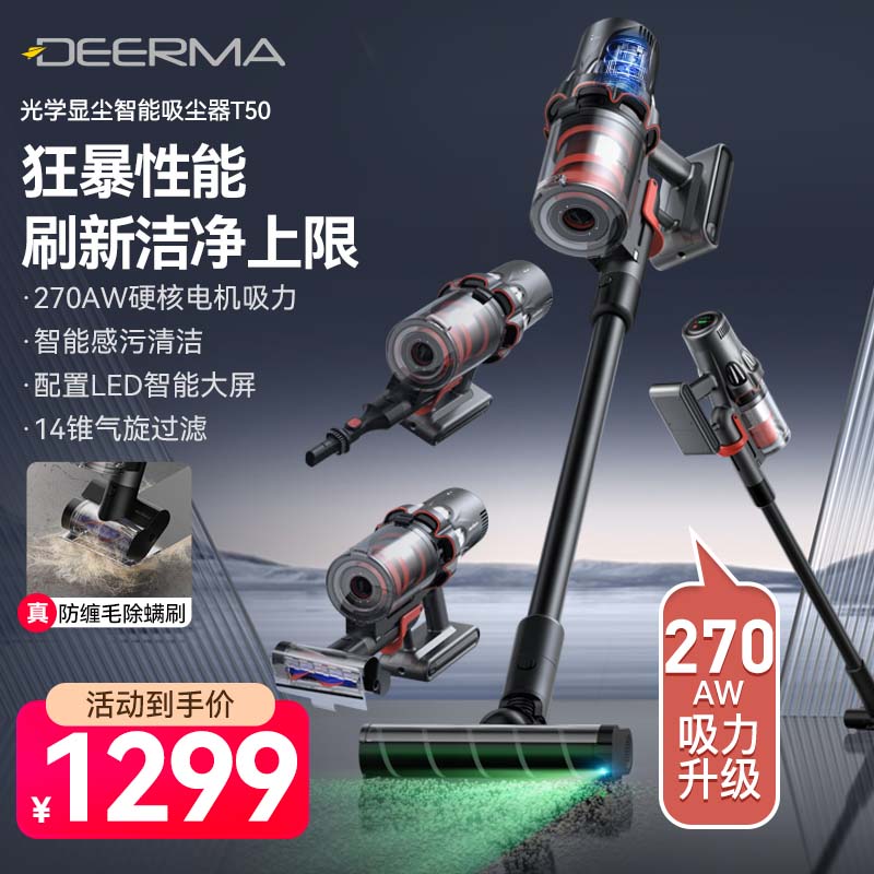 德尔玛(Deerma)T50无线吸尘器 【升级版】绿光显尘 14锥大吸力+90min长续航 防缠毛除尘 家/车/宠物吸尘家用 t50价格:1299.00元!