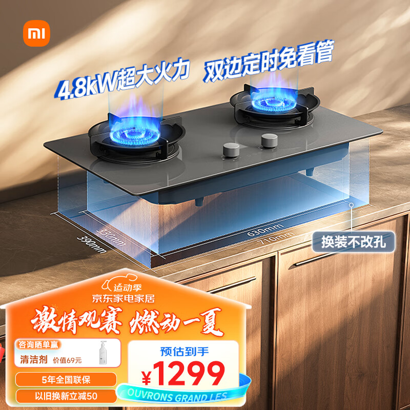米家米家小米家用燃气灶液化气 嵌入式双灶台4.8kW大火力猛火灶双边定时灶S2 可调节底盘灶具MJ04B 价格:1299.00元!