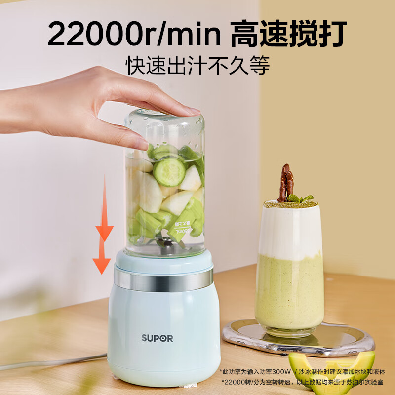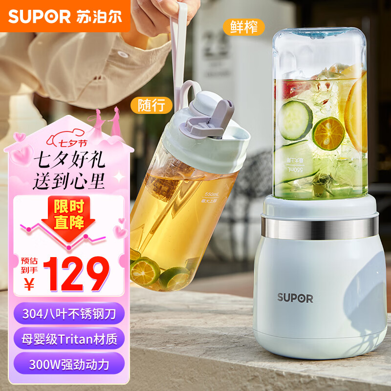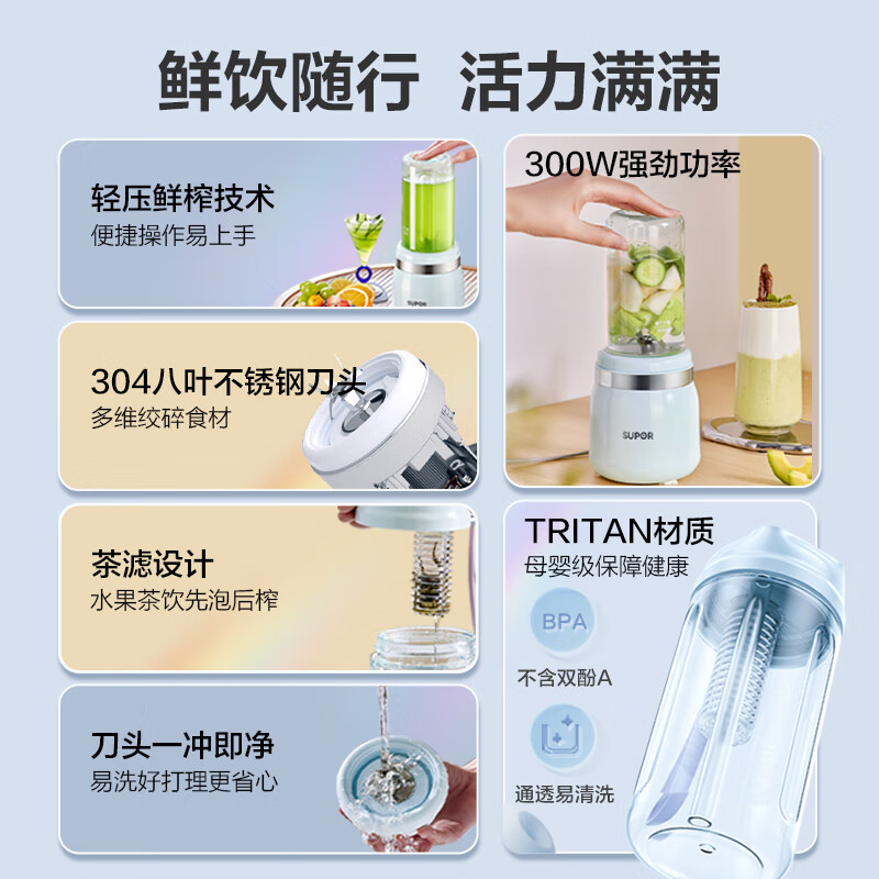 苏泊尔(SUPOR)家用榨汁机果汁杯随行杯 家用便携式小型迷你粉碎机多功能轻压鲜榨果汁机辅食机果蔬机TJE18价格:129.00元!