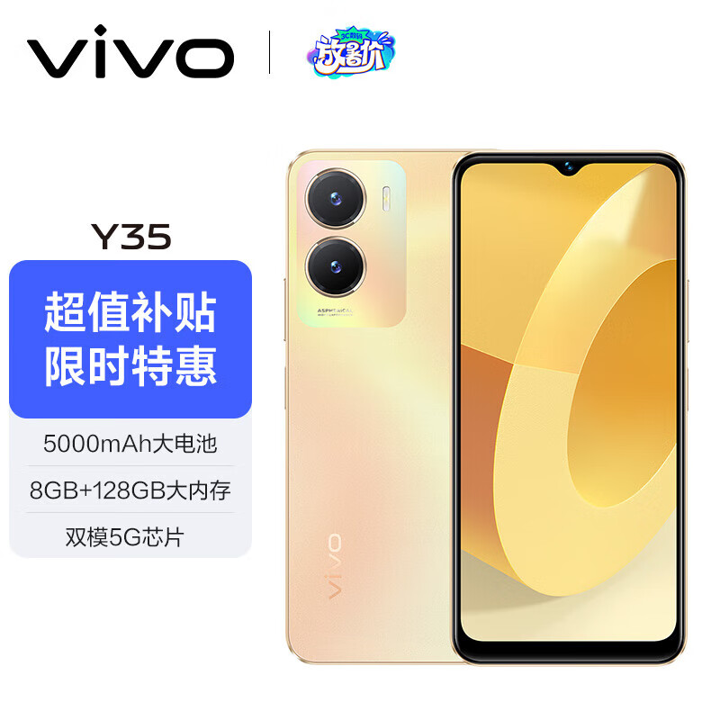 vivo Y35 8GB+128GB 晨曦金 5000mAh电池 闪耀外观 后置1300万影像系统 双模5G 通 老人 手机价格:1499.00元!