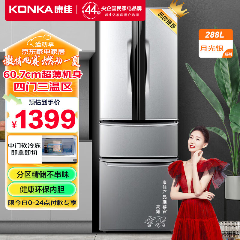 康佳288升多门法式四门双开门家用电冰箱超薄冰箱节能低噪养鲜速冷速冻锁鲜BCD-288GY4S价格:1399.00元!