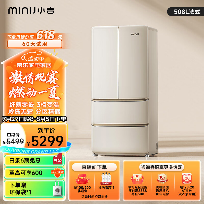 小吉(MINIJ)508L丨双变频一级能效法式多门家用客厅冰箱丨干湿分储变温低噪BCD-508WBS经典奶酪白价格:5299.00元!