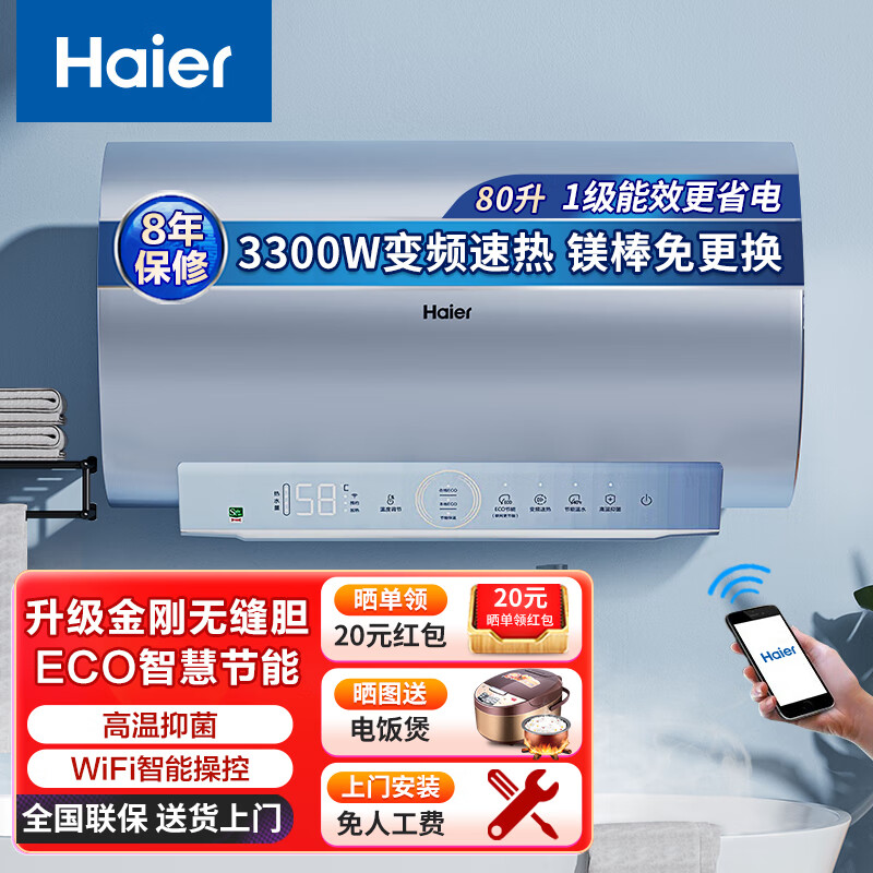 海尔(Haier)电热水器80升家用变频速热3300W储水式防电墙一级能效增容节能WIFI智控净水洗镁棒免更换PT5价格:1649.00元!