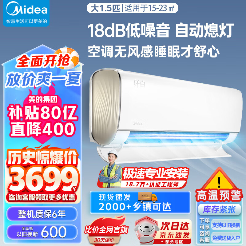 美的(Midea)空调 1.5匹 纤白 新一级能效变频冷暖 独立除湿 舒适无风感 家用壁挂式空调挂机 KFR-35GW/N8MWD1价格:3699.00元!