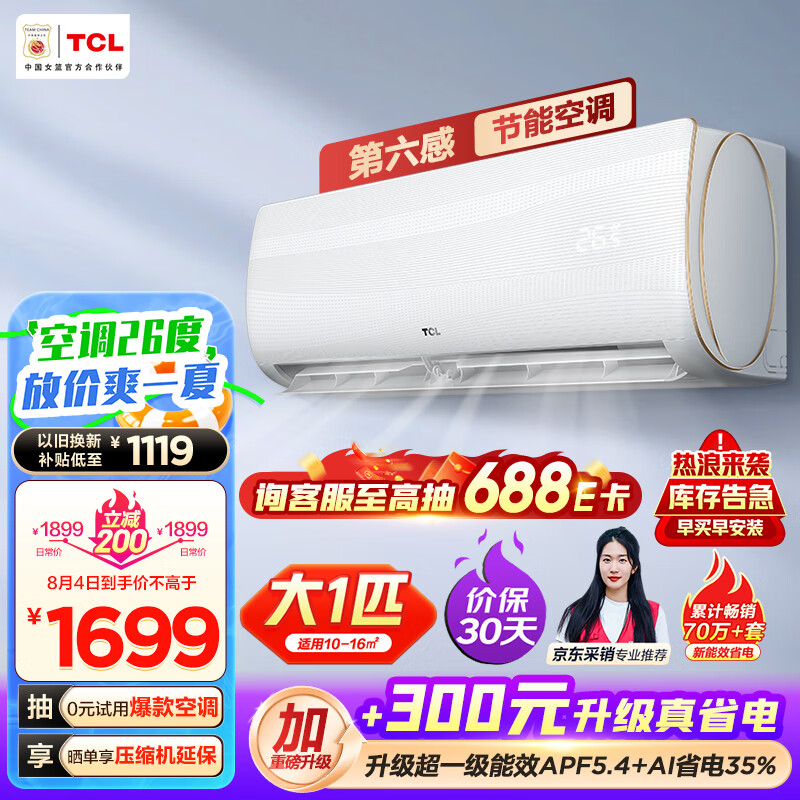 TCL 空调 大1匹 新三级能效 变频冷暖 第六感 卧室壁挂式空调挂机KFRd-26GW/D-XQ11Bp(B3)以旧换新价格:1699.00元!