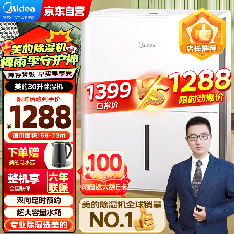 美的(Midea)除湿机/抽湿机 家用抽湿器 30升/天 卧室客厅干衣去湿 地下室吸湿器除湿器 智能控湿CF30BD/N7-DP5价格:1288.00元!