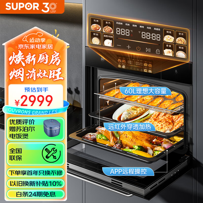 苏泊尔(SUPOR)嵌入式蒸烤炖炸一体机家用智能多功能蒸箱烤箱炖煮空气炸 60LAPP操控蒸汽自清洁 DY58蒸烤价格:2999.00元!