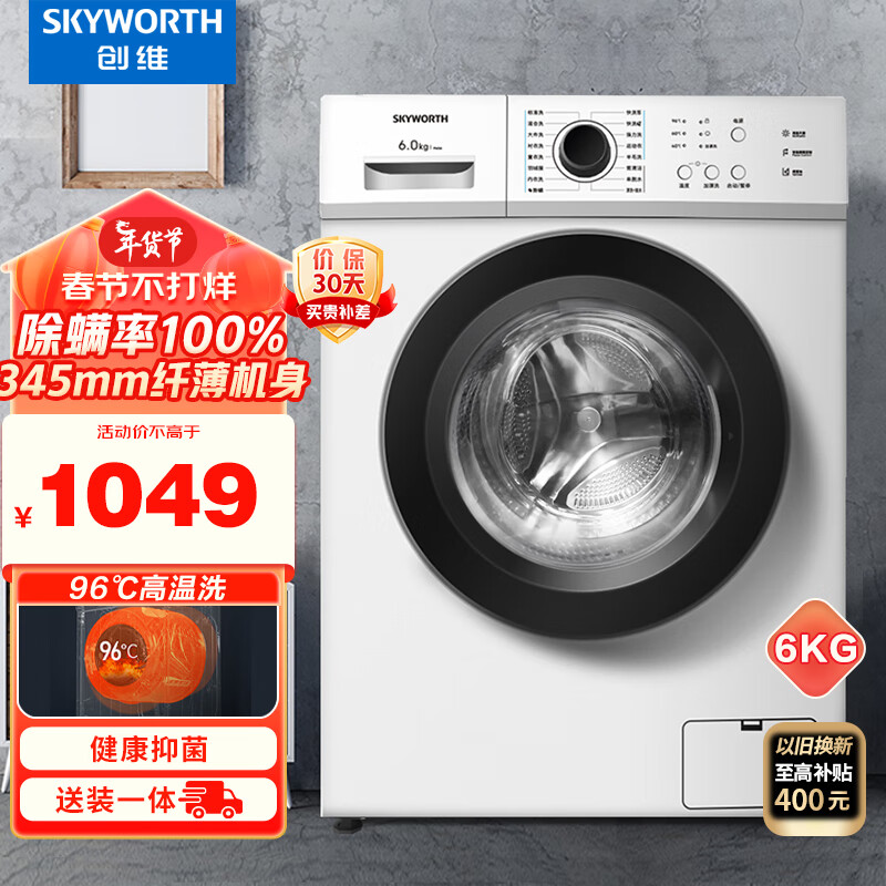 创维(SKYWORTH) 6公斤全自动滚筒洗衣机? 超薄嵌入 金属机身 16种洗涤程序 高温除螨洗 F60A价格:1049.00元!