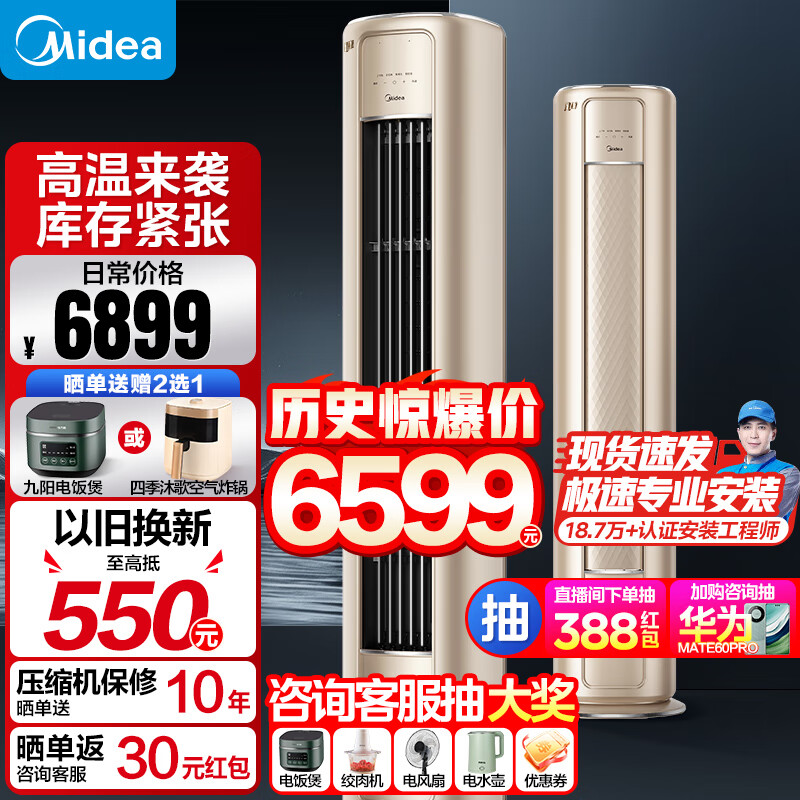 美的(Midea)空调大3匹风尊 新一级能效 变频冷暖 客厅立式空调智能除菌柜机3D立体风防直吹大风口金色圆形柜价格:6549.00元!