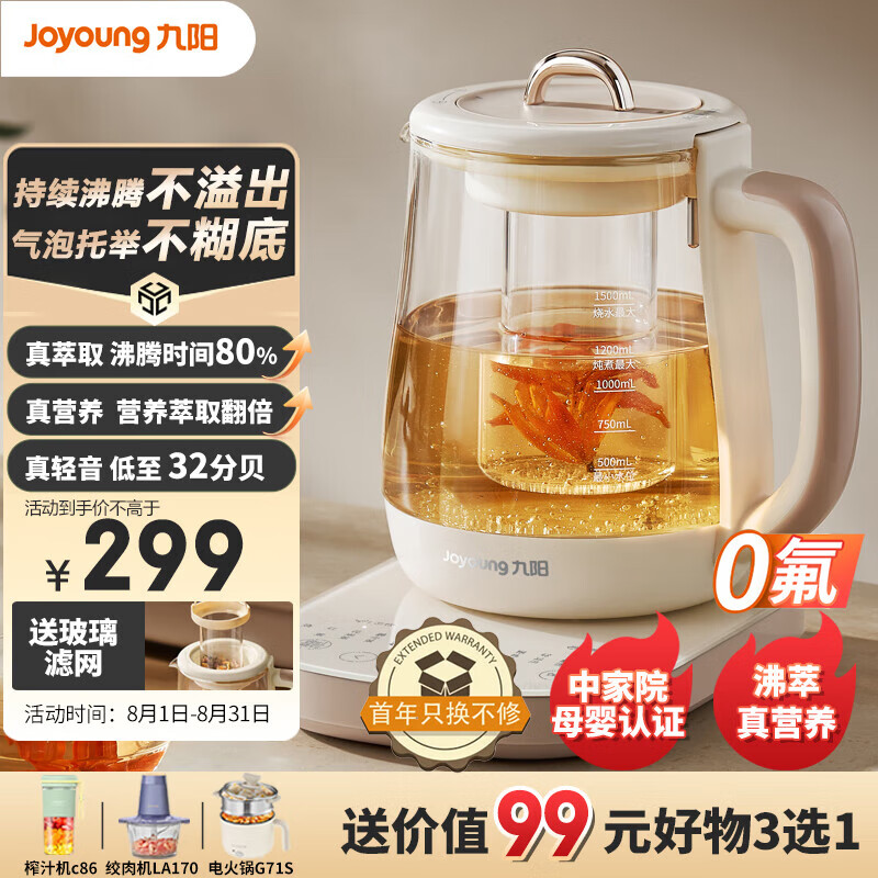 九阳(Joyoung)防溢沸萃家用养生壶 小气泡防糊 1200W大功率 玻璃滤网 智能炖煮 玻璃面板 玻璃花茶壶15WY1J价格:299.00元!