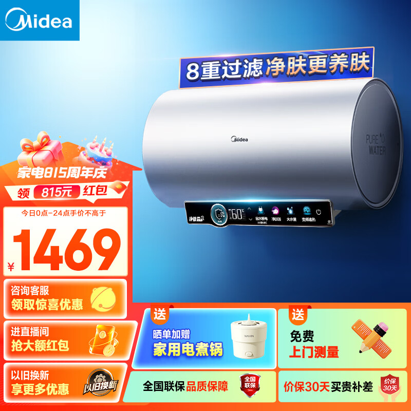 美的(Midea)净肤洗电热水器80升家用 3300W变频 出水断电 镁棒免更换 一级能效以旧换新F8032-JA7(HE)价格:1569.00元!