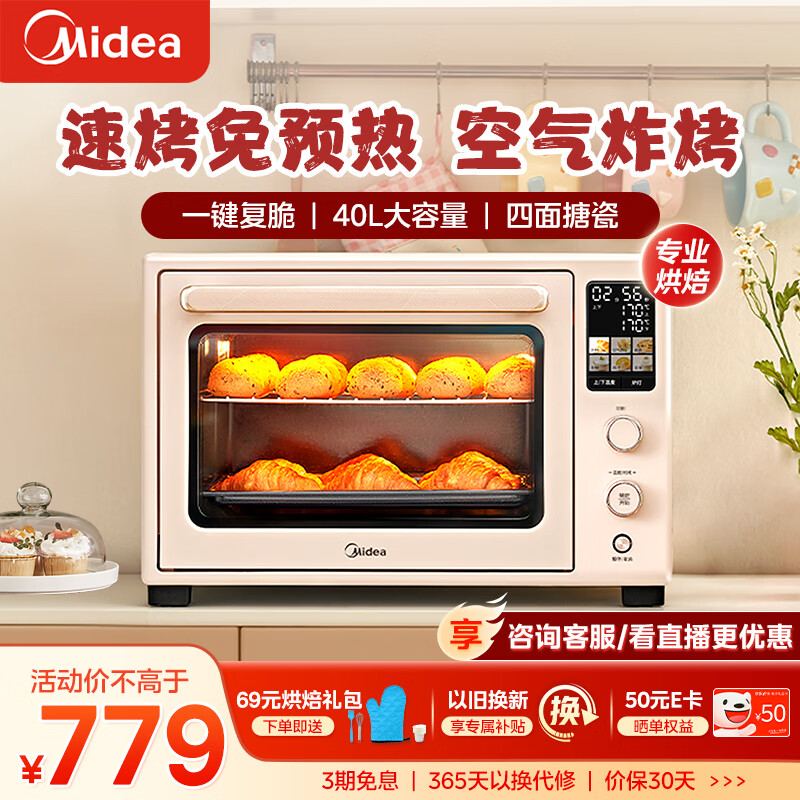 美的(Midea)Q40风炉家用多功能烤箱 石墨烯免预热/热风空气炸/四面搪瓷/彩屏屏显/复脆/发酵 奶油桃色价格:779.00元!