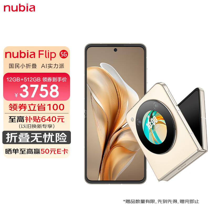 nubia努比亚 Flip 12GB+512GB 奶茶色 5000万后置双摄 120Hz屏 5G 拍照 AI 小折叠屏手机价格:3858.00元!