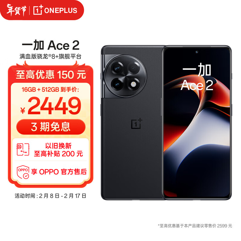 一加 Ace 2 16GB+512GB 浩瀚黑 满血版骁龙8+旗舰平台 1.5K 灵犀触控屏 OPPO AI手机 5G学生游戏手机价格:2599.00元!
