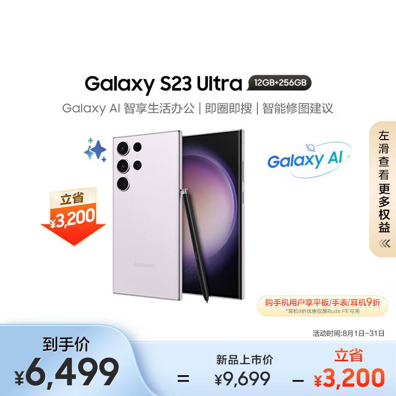 三星(SAMSUNG)Galaxy S23 Ultra AI手机 2亿像素 拍照手机 大屏S Pen书写 同声翻译 12GB+256GB 悠雾紫 游戏手机价格:6499.00元!