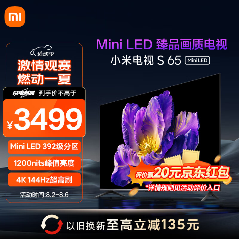 小米电视S65 Mini LED 65英寸 392分区 1200nits 4GB+64GB 澎湃OS系统 平板电视机L65MA-SPL价格:3499.00元!