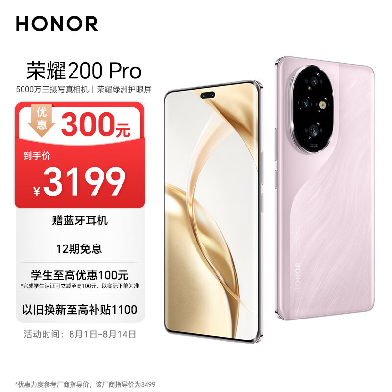 荣耀200 Pro 旗舰级青海湖电池 绿洲护眼屏 雅顾光影主摄 第三代骁龙8s 12+256 珊瑚粉 5G AI价格:3199.00元!