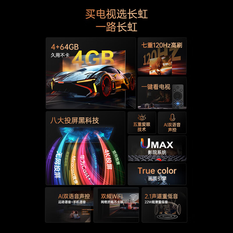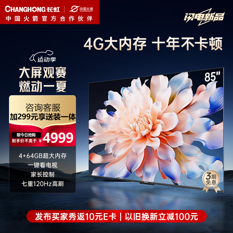 长虹电视85D66F 85英寸4K超高清 4+64GB超大内存 一键看电视 120Hz高刷新液晶电视机 以旧换新价格:4999.00元!