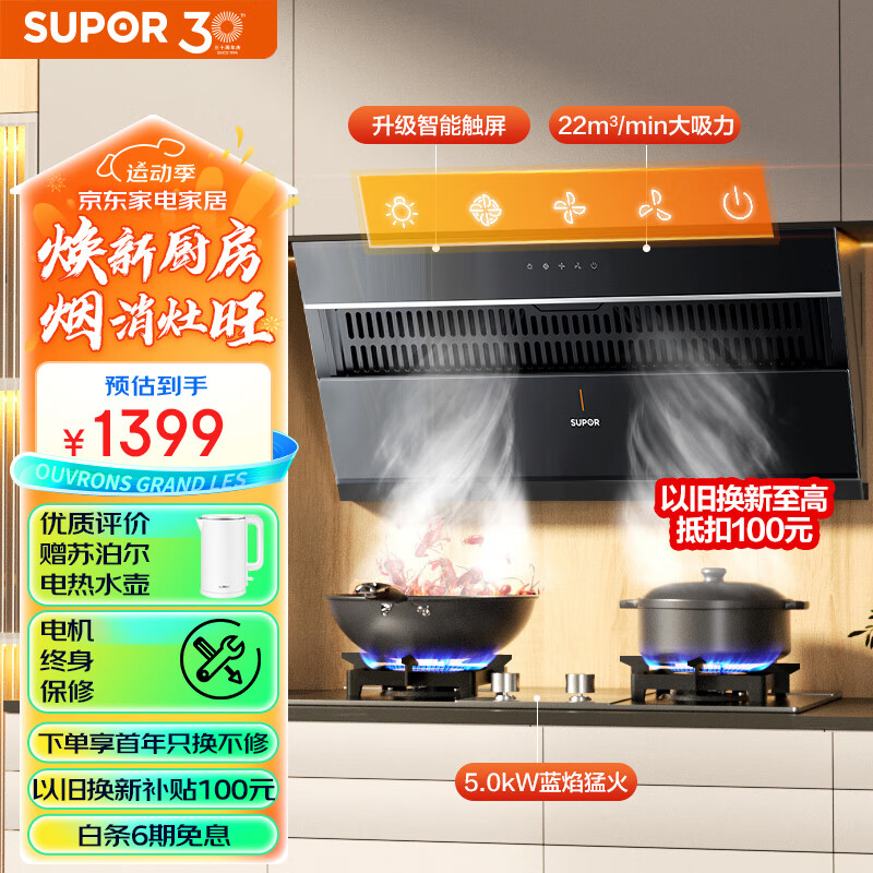 苏泊尔(SUPOR)抽油烟机侧吸式爆炒22立方大吸力家用吸油烟机450pa强劲风压油烟机燃气灶套装DJ11+DS35液价格:1399.00元!