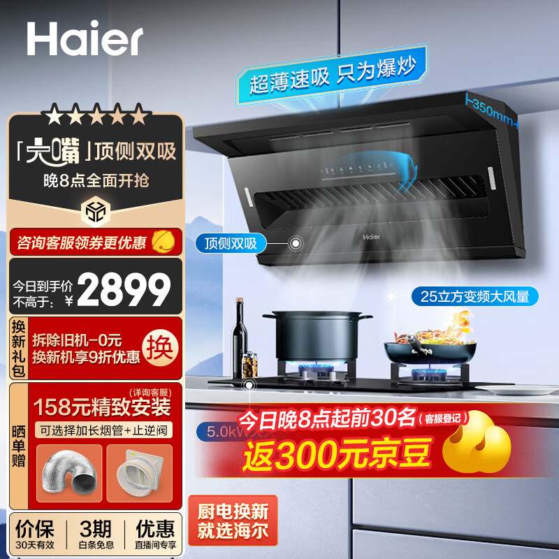 海尔(Haier)抽油烟机 顶侧双吸烟灶套装 变频25m3/min大吸力 5.0kw家用厨房吸油烟机燃气灶具套装C61+Q2BE2天价格:2899.00元!