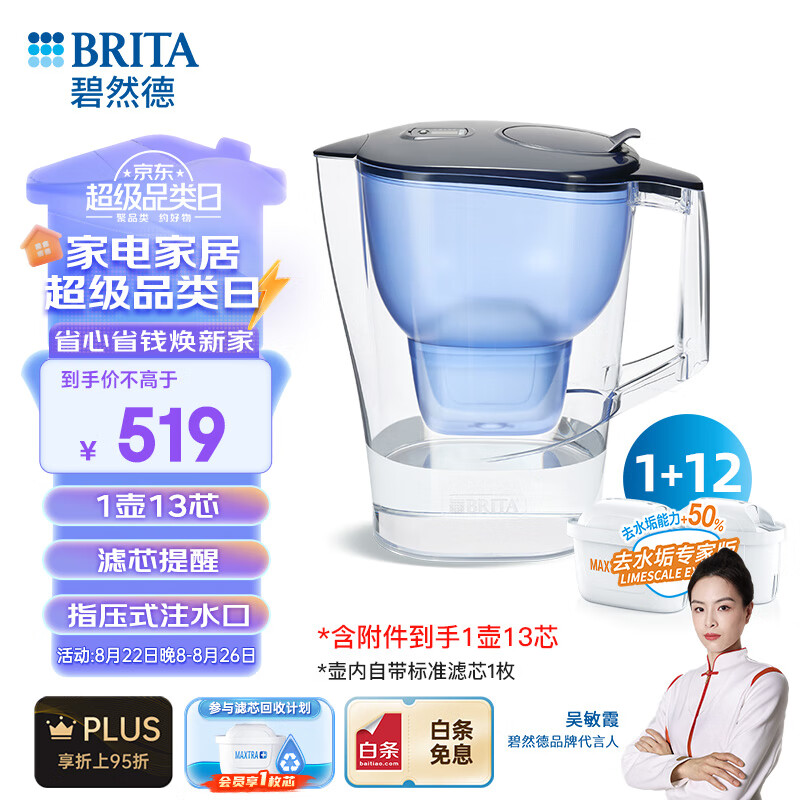 碧然德(BRITA)过滤净水器 家用滤水壶 Kalea 晨汐系列XL 3.5L(蓝)+专家版滤芯12枚(含组套)价格:519.00元!