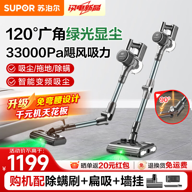 苏泊尔(SUPOR)吸尘器家用洗地机手持无线吸拖一体免弯腰33kpa大吸力双滚刷长续航除螨宠物吸毛绿光显尘EM5-L价格:1199.00元!