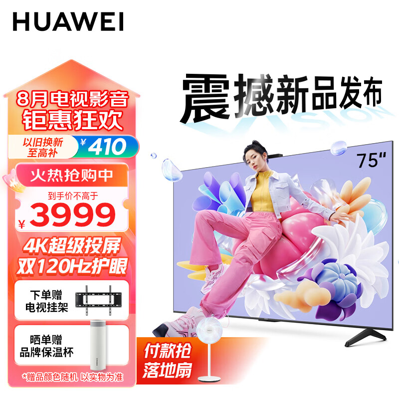 华为电视75英寸Vision智慧屏 4 SE Pura 70投屏好搭档 AI摄像头超高清智能液晶超薄电视机HD75KUNL价格:3969.00元!